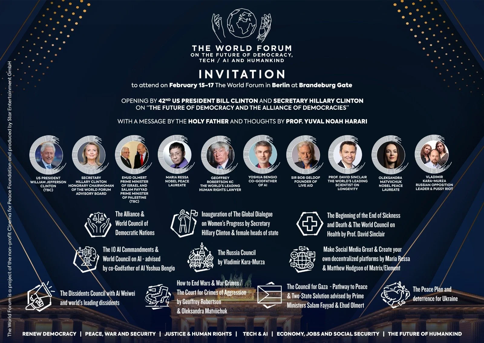 Am 16. und 17. Februar 2026 wird das Hotel Adlon Kempinski in Berlin zum internationalen Treffpunkt für Vordenker und Gestalter aus Politik, Philosophie, Wissenschaft und Kultur. Die Konferenz WORLD FORUM ON DEMOCRACY, unter der Ehrenpräsidentschaft der „Honorary Chairwoman of the Advisory Board“, Secretary Hillary Clinton. bringt globale Stimmen in vielfältigen Vorträgen und Podiumsgesprächen zusammen, um Antworten auf die zentralen Fragen unserer Zeit zu entwickeln. Diskutieren Sie mit, leisten Sie Ihren Beitrag zur Entwicklung neuer Konzepte und Gesetzesvorlagen – darunter die „10 KI-Gebote“ für eine sichere technologische Zukunft – sowie zu Initiativen für Regierungen im Exil, um zu verhindern, dass ein Autokrat dem nächsten folgt.